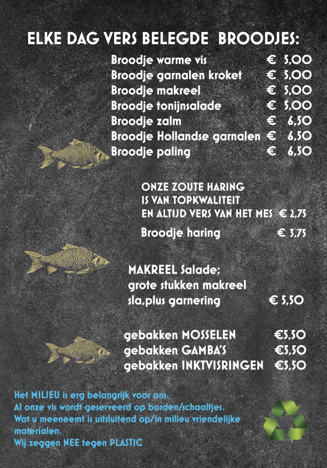 Wist u dat wij uw vis verpakken in uitsluitend duurzame materialen zoals rietsuiker, pla, bamboe en gerecycled papier. Vis in de winkel komt uiteraard gewoon op een bord.